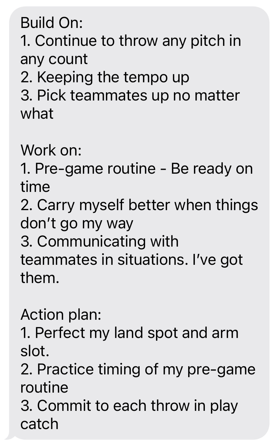 If you can watch each pitch or AB after a game, do it. Take the positive and negative emotion from a performance with a cold score viewed rationally. The score is based on whether you executed in each opportunity.